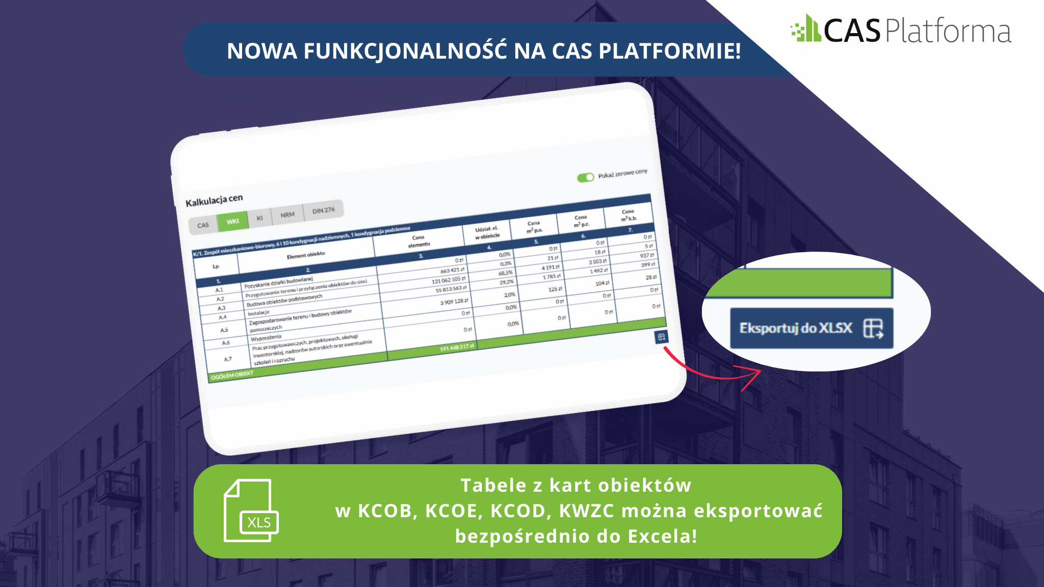 Mamy nową funkcjonalność na CAS Platformie! Aby ułatwić Ci pracę, dodaliśmy możliwość eksportu tabel z kart obiektów w KCOB, KCOE, KCOD oraz KWZC bezpośrednio do Excela.
